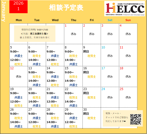 お知らせ お知らせ 2026年1月相談予定のお知らせ 2026年1月相談予定のお知らせ 広島県・今治市雇用労働相談センター(HiELCC)2026年1月の相談対応予定をお知らせいたします。 [ご連絡先] 〒730-8510 広島県広島市中区基町5-44 広島商工会議所ビル5F TEL: 0120-540-690 HP:https://hi-elcc.mhlw.go.jp/ 2026年1月28日(水)「企業の労務管理と近年の動向」~テレワーク時代の労働管理・管理監督署の範囲見直し・退職代行のトラブルの急増と企業対応~ 一覧に戻る