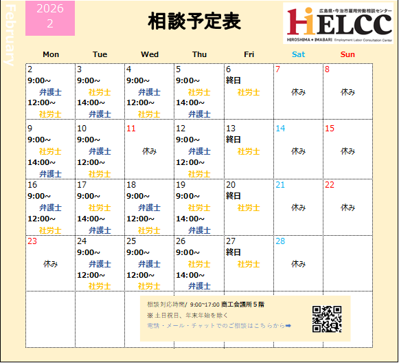 お知らせ お知らせ 2026年2月相談予定のお知らせ 2026年2月相談予定のお知らせ 広島県・今治市雇用労働相談センター(HiELCC)2026年2月の相談対応予定をお知らせいたします。 [ご連絡先] 〒730-8510 広島県広島市中区基町5-44 広島商工会議所ビル5F TEL: 0120-540-690 HP:https://hi-elcc.mhlw.go.jp/ 2026年1月27日(火)ヒトコトLABO 〜壁打ちトーク!話す、と、見える。しくみの話も、モヤモヤも。人事労務のこと、campsで話そう~ 一覧に戻る 2026年2月24日(火)ヒトコトLABO 〜壁打ちトーク!話す、と、見える。しくみの話も、モヤモヤも。人事労務のこと、campsで話そう~